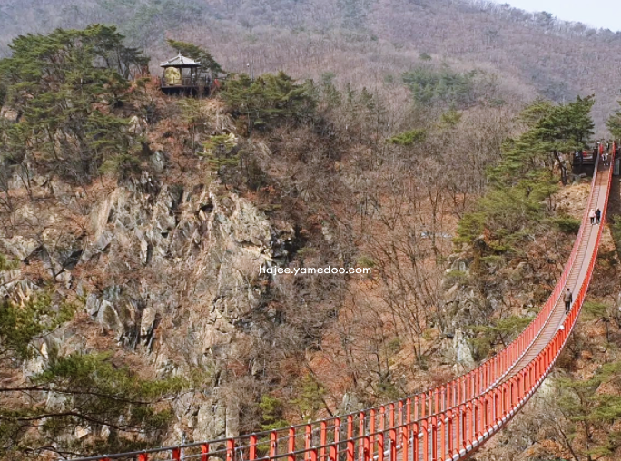 다리 앞에 섰을 때, 길게 이어진 출렁다리가 양쪽으로 펼쳐진 산세와 어우러져 장관을 이루었습니다. 첫 발을 내딛자마자 다리가 살짝 흔들리며 아래쪽 계곡이 내려다보였는데, 그 아찔함 속에서도 자연과 가까워지는 느낌이 강렬했습니다.