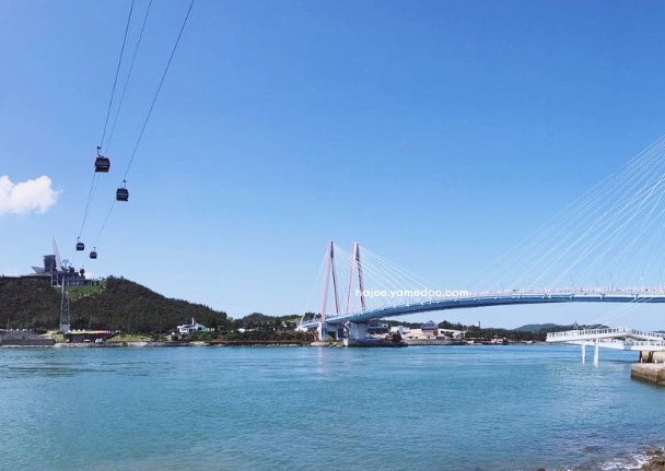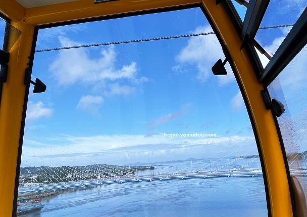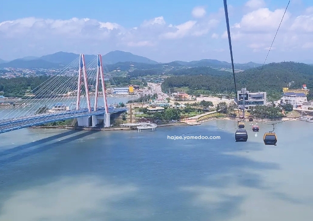 아래로 보이는 해협은 이순신 장군의 명량대첩이 벌어졌던 역사적인 현장으로, 바다를 내려다보며 그날의 격전을 상상하니 감회가 새로웠습니다. 케이블카는 바다를 가로지르며 양쪽의 아름다운 산과 해안선을 가까이에서 감상할 수 있어 마치 하늘을 나는 듯한 기분을 선사했습니다.