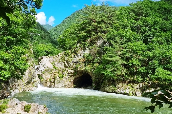 두타연은 맑은 계곡물과 울창한 숲이 어우러진 자연 그대로의 양구 가볼만한곳 베스트10입니다. 입구에서부터 걷다 보면 푸른 나무들이 길을 따라 이어지며 한적한 분위기를 만들어 줍니다. 계곡물은 투명하게 흐르며 바닥이 훤히 보일 정도로 깨끗하고, 주변 바위들과 조화를 이루어 고요한 느낌을 줍니다.