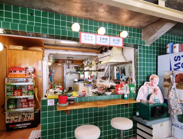 라면이 정말 맛있는 곳 가게 한쪽에는 직접 만든 수제 음료와 간단한 디저트를 판매하고 있어 잠시 쉬어가기에 좋습니다. 내부 곳곳에는 오래된 라디오와 타자기, 흑백사진 등이 배치되어 있어 마치 시간이 멈춘 듯한 느낌을 줍니다.
