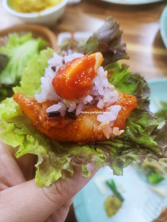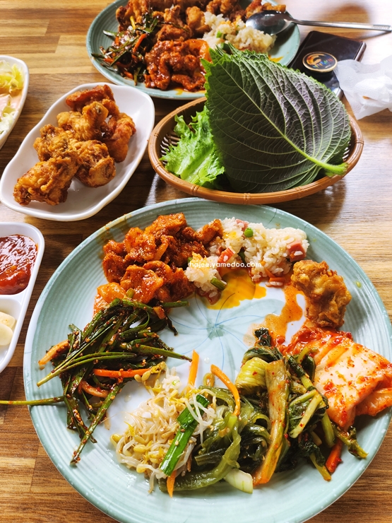 제육볶음은 매콤하면서도 달콤해 쌈에 싸서 먹기에 딱 좋았습니다. 쌈채소는 신선했고, 다양한 나물 반찬들이 조화를 이루어 식사의 만족도를 높였습니다.
