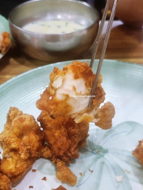자리에 앉아 본격적으로 먹기 시작했습니다. 치킨은 겉은 바삭하고 속은 촉촉했습니다. 기름지지 않고 담백해 계속 손이 갔습니다.