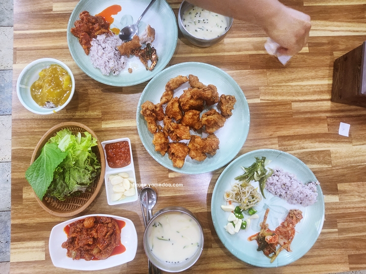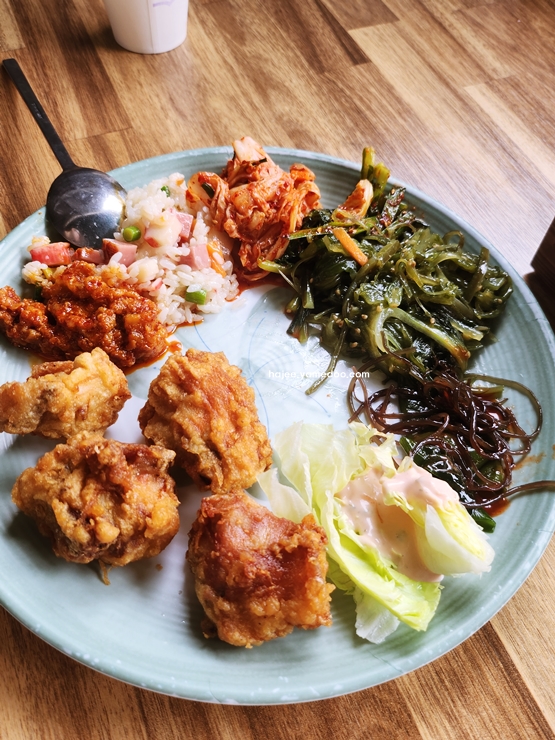 입장 후 자리를 잡고 한식 뷔페를 둘러보았습니다. 메뉴는 제육볶음, 다양한 나물 반찬, 김치 등 푸짐했습니다. 무엇보다 수요일에 방문해 치킨이 나온다는 점이 가장 기대됐습니다.