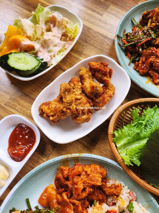 마침 갓 튀긴 치킨이 준비되어 있었습니다. 튀김옷이 바삭하고 고소한 냄새가 퍼져서 입맛을 돋우더군요. 치킨을 몇 조각 접시에 담고, 제육볶음과 쌈채소도 곁들였습니다.