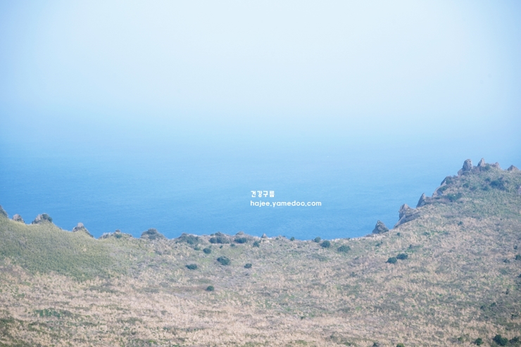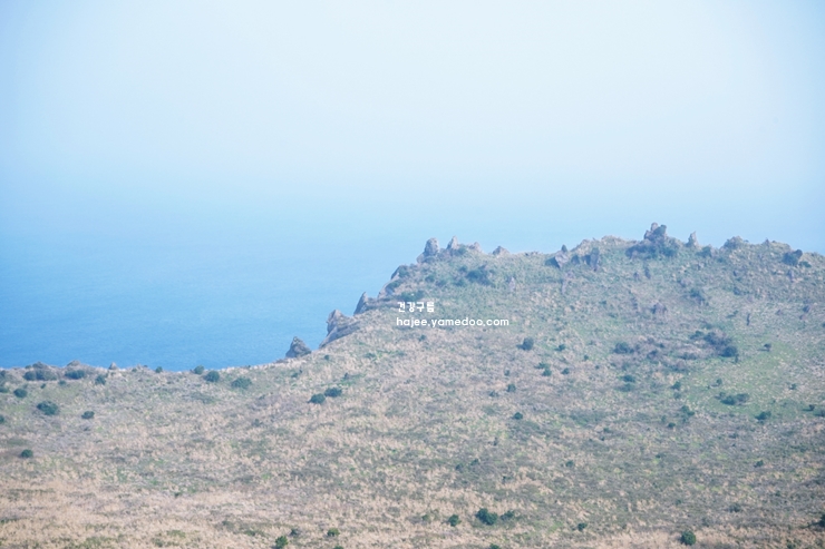 초록빛이 도는 분화구 안쪽과 푸른 바다가 어우러지는 풍경은 감탄을 자아냈다. 분화구의 가장자리를 따라 이어진 능선은 마치 용의 등처럼 굴곡져 있었고, 그 끝자락에서 바라보는 풍경은 정말 멋졌다.