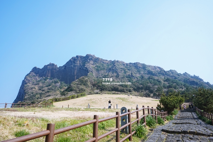 날씨도 화창하고 바람도 선선해 오르기에 딱 좋은 날이었다. 계단을 따라 천천히 오르기 시작하자 넓게 펼쳐진 목초지와 푸른 하늘이 눈앞에 펼쳐졌다. 성산일출봉의 초입은 완만한 경사로 이루어져 있어 부담 없이 산책을 즐길 수 있었다.