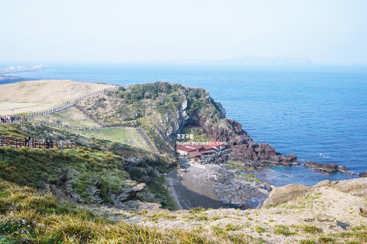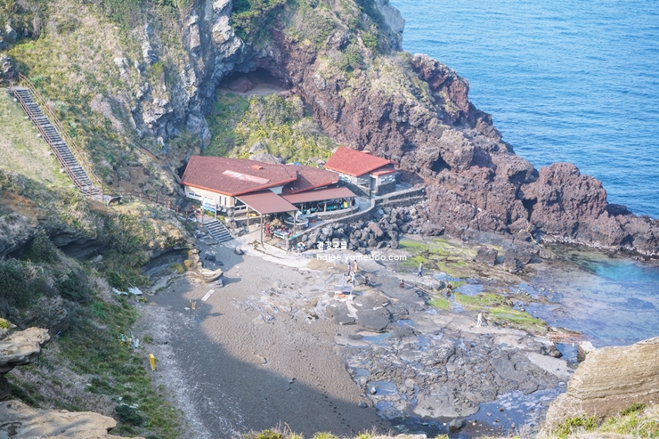 내려오는 길에 아래쪽 해안가에 위치한 작은 어촌과 해녀들이 일하는 모습을 볼 수 있었다. 특히 바다에 맞닿아 있는 작은 오두막이 인상적이었다. 해안가로 내려가는 길은 계단으로 잘 정비되어 있어 내려가는 데 불편함이 없었다.