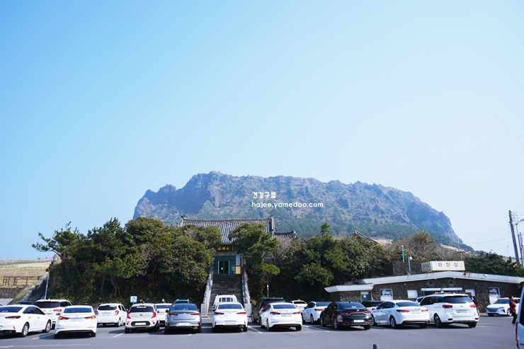유채꽃밭을 지나 성산일출봉 입구에 도착하자, 수많은 차량과 관광객들로 북적이는 모습이 보였다. 성산일출봉을 배경으로 세워진 '성산일출봉' 표지석에서 기념사진을 찍는 사람들의 모습도 눈에 띄었다. 이곳은 UNESCO 세계자연유산으로 등재된 곳답게 관리가 잘 되어 있었고, 깔끔한 주차장과 화장실 시설도 마련되어 있어 편리했다.