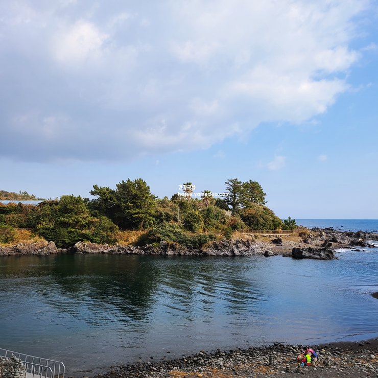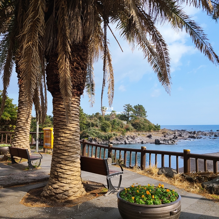 바닷가를 따라 천천히 걷다 보면 야자수가 자리한 쉼터가 보이는데, 그곳에서 잠시 쉬며 바람을 느끼는 것만으로도 여행의 피로가 풀리는 기분이었습니다. 눈앞에 펼쳐진 해안선과 아기자기한 풍경들은 그야말로 제주에서만 느낄 수 있는 특별함이었습니다.