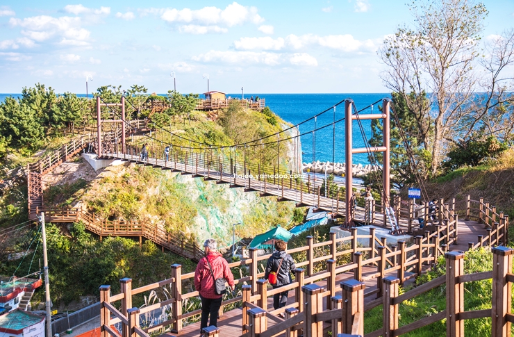 후포항 인근에 위치한 등기산 스카이워크는 높이 20m, 길이 135m의 해상 다리로, 그중 57m는 강화유리 바닥으로 되어 있어 마치 바다 위를 걷는 듯한 스릴을 선사하는 울진 가볼만한곳 베스트10 입니다.