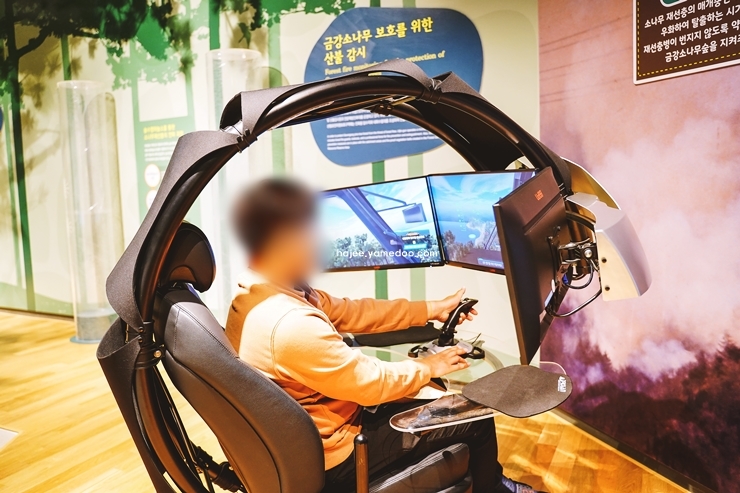 또한, 헬기 조정 시뮬레이션을 통해 산불 진화와 재선충 방제 체험을 할 수 있어 흥미로웠습니다. 1층 제2전시실에는 VR 소나무 짚라인 체험이 있어 아이들과 함께 방문하기에 좋습니다.