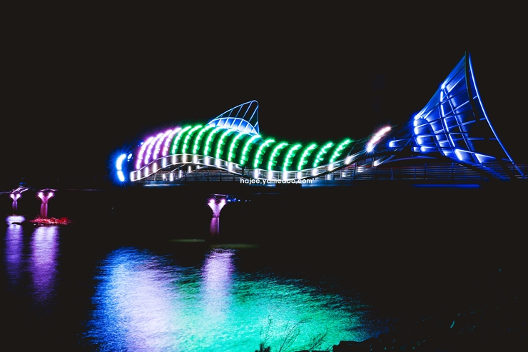 다리 위를 천천히 걸으며 바람을 맞으니 시원하고 기분이 좋았습니다. 아래로는 고요하게 흐르는 물이 다리의 불빛을 그대로 비추어 더욱 환상적이었습니다. 다리 끝에서 바라본 풍경은 주변 자연과 조명이 어우러져 그림 같은 장면을 연출했습니다.